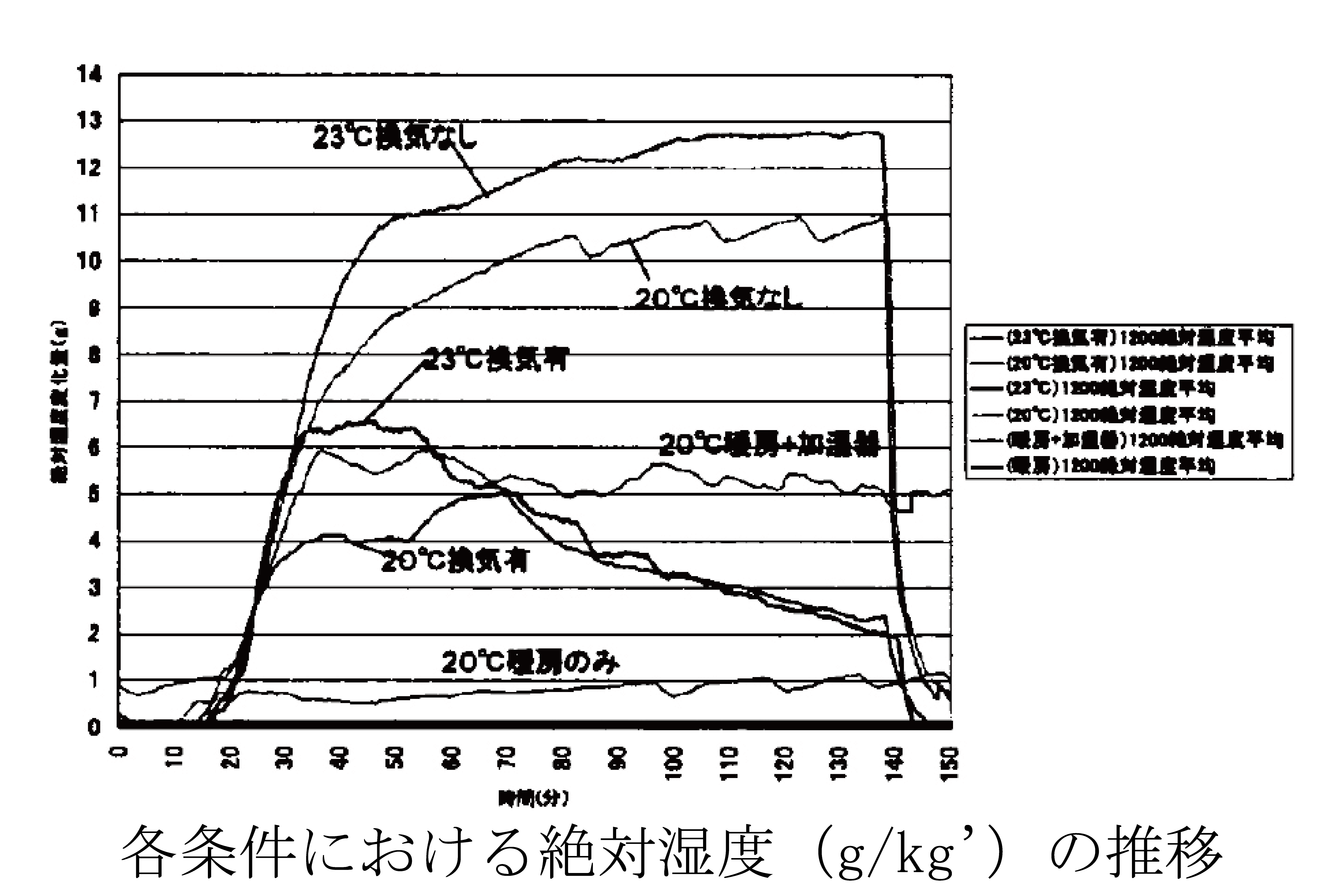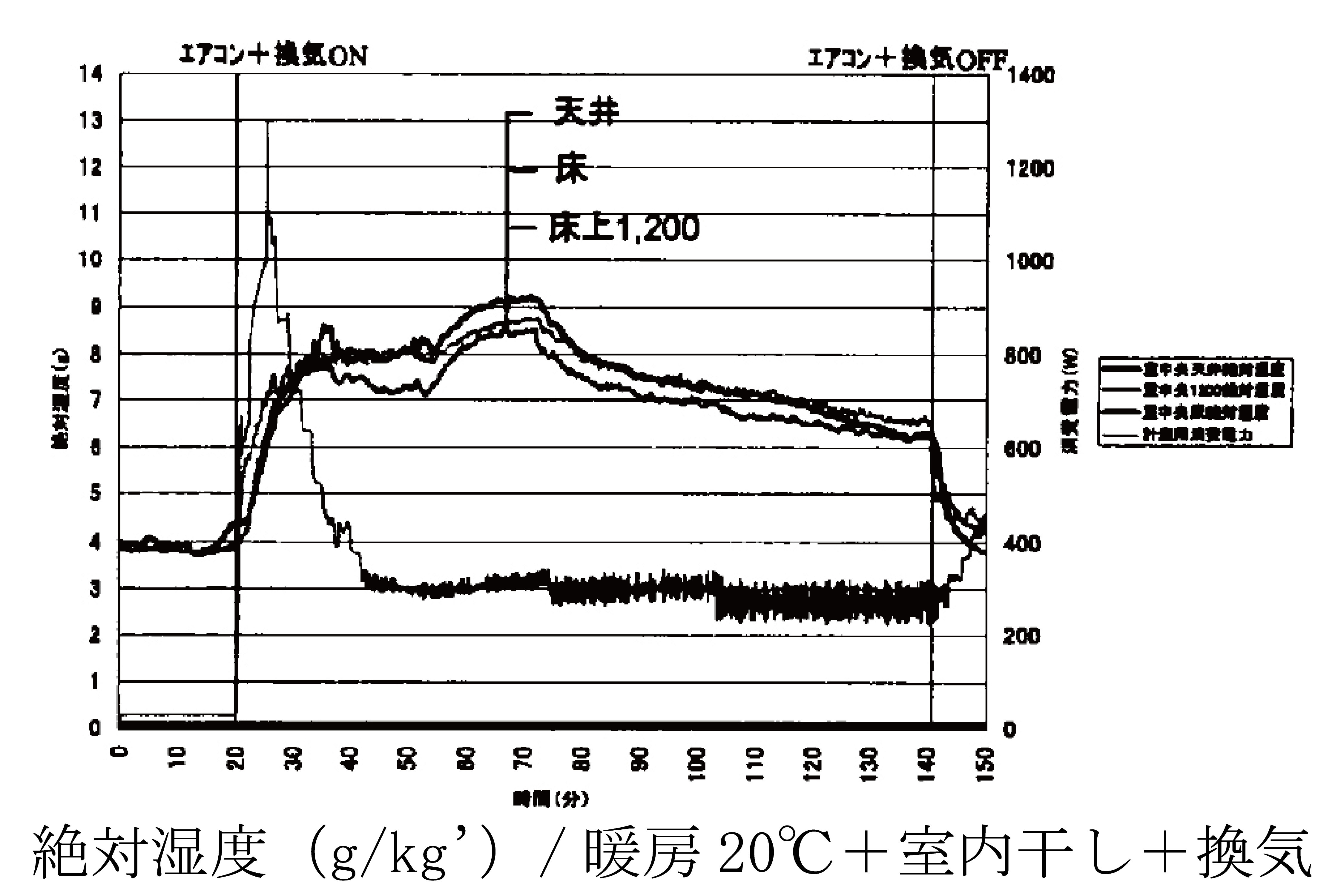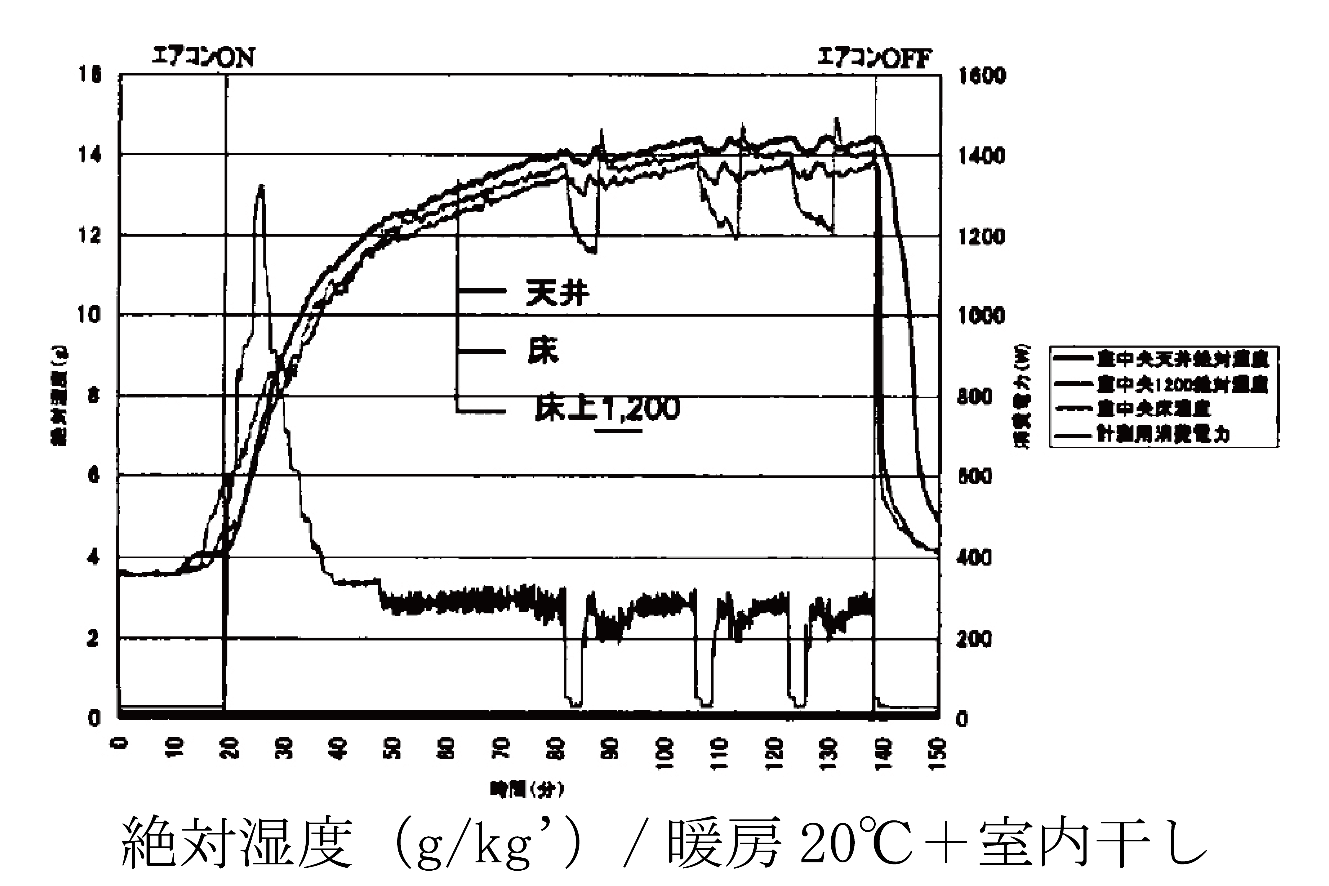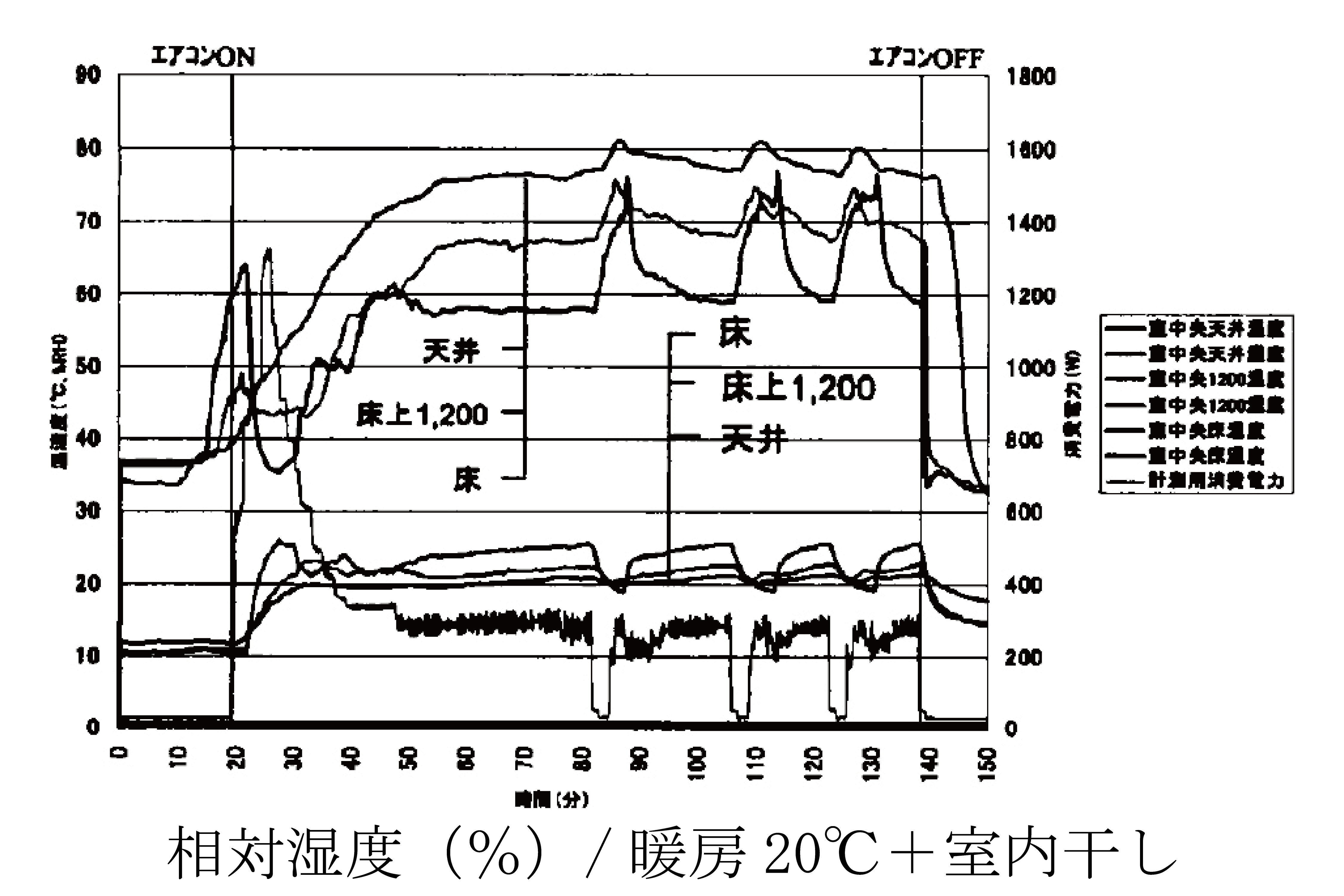 ・ただし、最初の20~25分で洗濯物から急激に放湿され、その後、エアコン暖房の出力低下に伴い放湿は穏やかになるため、