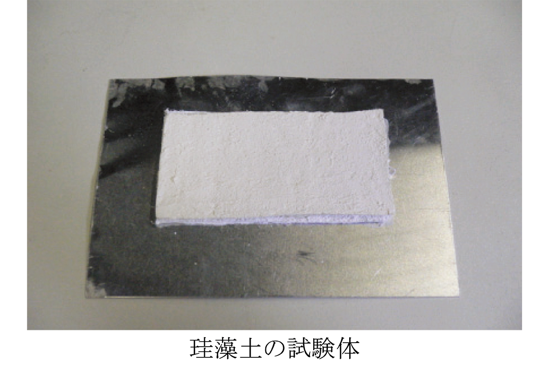 この実験では珪藻土と木炭入り塗り材の2種類の仕上げ塗り材を金属板の表面に面積50㎠、厚さ2mmで塗布した試験体を準備しました。