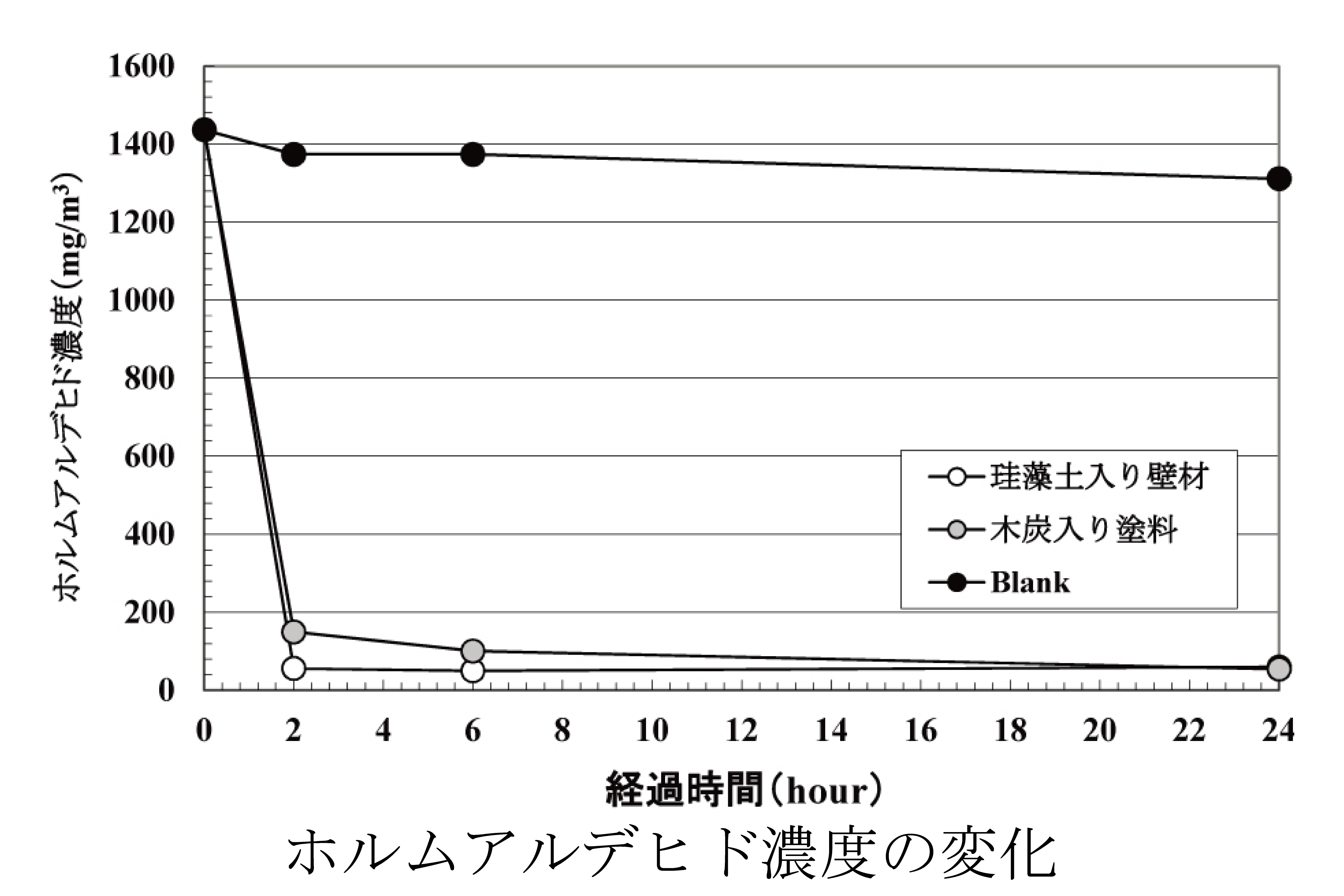 これらの結果から、珪藻土や木炭を利用した塗り材は「仕上げ材」であると同時に、室内の空気の質を改善する効果があることがわかります。
