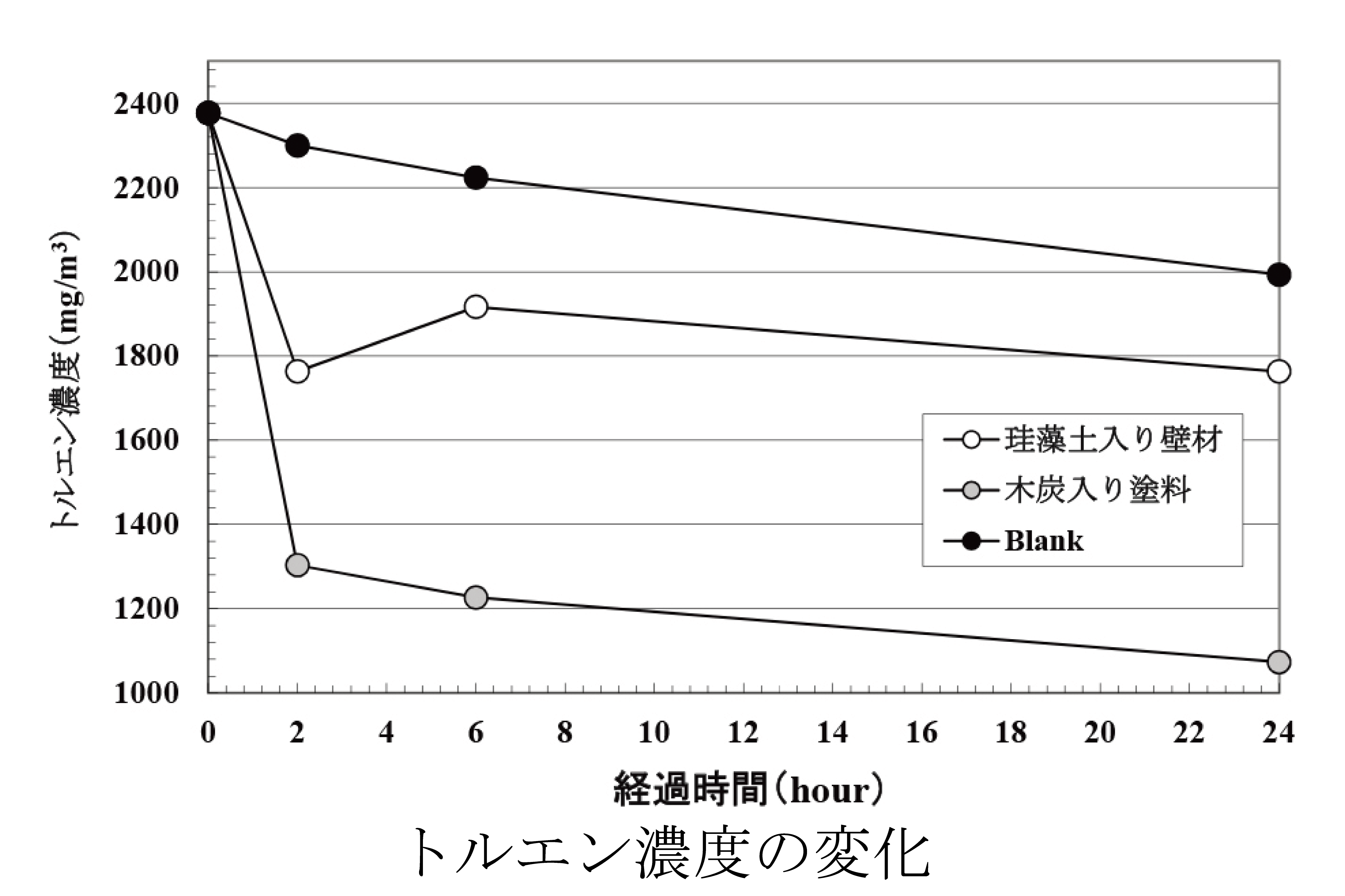 トルエンガスの濃度は珪藻土と木炭入り塗り材の両方木炭入り塗り材の両方で有意に下がりました。特に木炭入り塗り材の方が、トルエンに対しては高い吸着性能を発揮しました。