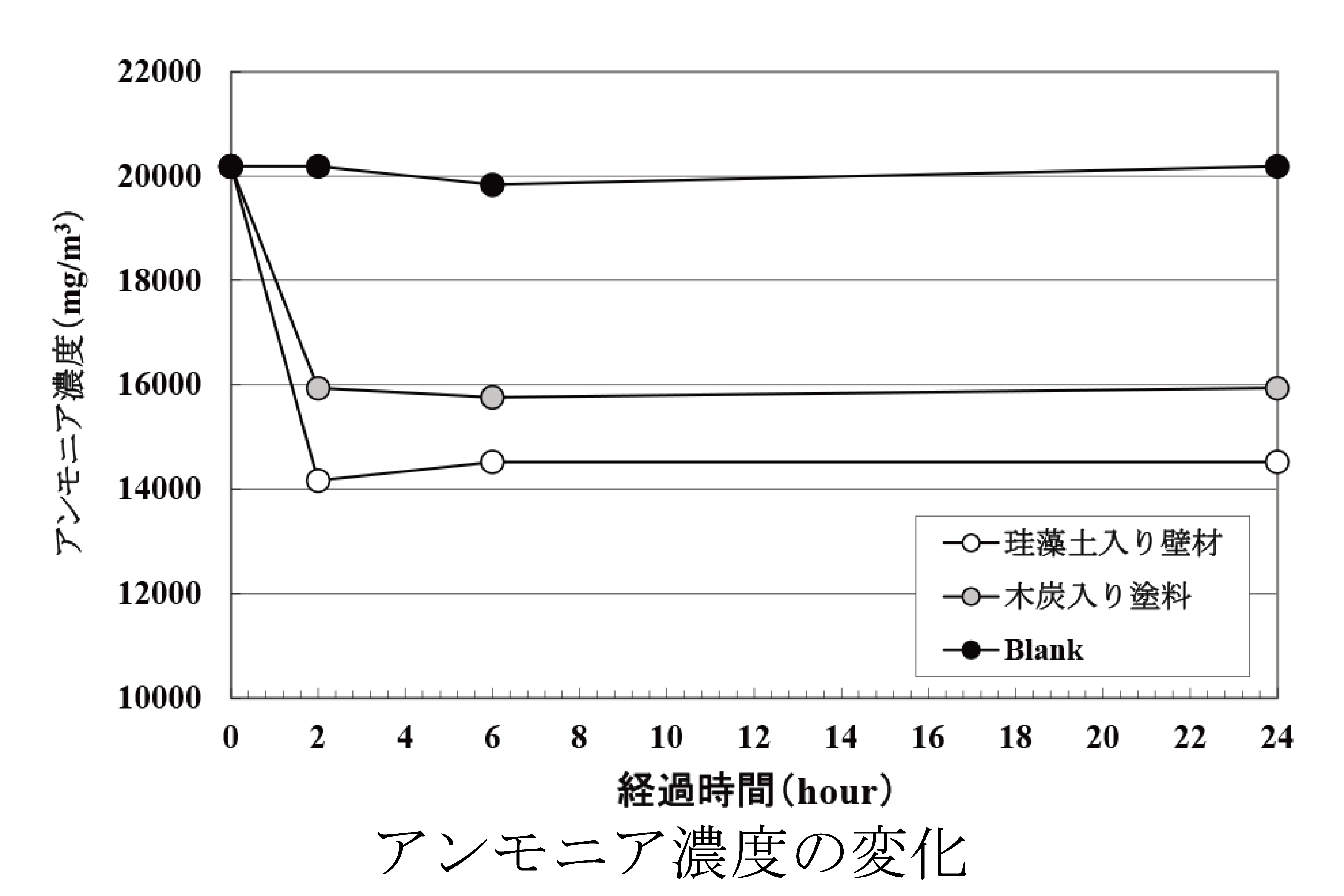 アンモニアガスの濃度は珪藻土と木炭入り塗り材の両方木炭入り塗り材の両方で有意に下がりました。わずかですが、珪藻土の方が、アンモニアに対して高い吸着性能を発揮しました。