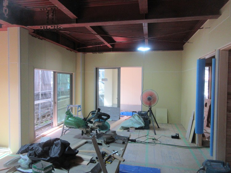 いま急ピッチで進んでいるのが内装の下地工事です。1階では壁の珪藻土下地のプラスターボードが張られています。当初は和紙で仕上げるつもりでしたが、天井の鉄骨をそのまま塗装して化粧として使うため、その部分での調湿性能が期待できないことから、急遽和紙より調湿の性能が高い珪藻土に替えました。和紙も珪藻土も下地は同じプラスターボードが使えるので下地に変更はありません。