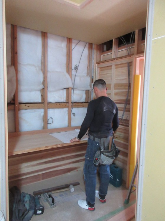 写真は桧のカウンターの上に大きな医療用の洗面器を埋め込むための位置決めをしているところ。洗面器は80センチもの横幅がある使い勝手に優れたものを入れるので、1メートル80センチを超える広いカウンターも半分ほどはこの洗面器に占領されそうです。