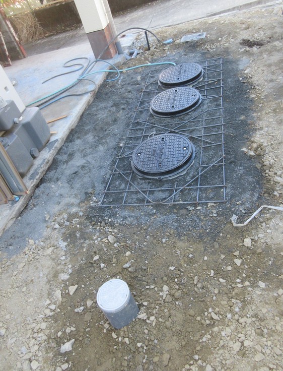 スロープを降りたところには新しく浄化槽を埋めます。現況の浄化槽は単独槽といって、汚水のみを浄化し、台所などから出る雑排水は浄化しません。今度入るのは合併浄化槽です。住まいから出るすべての水を浄化します。浄化槽の上を車が走るので、マンホールの蓋も耐荷重蓋にしました。