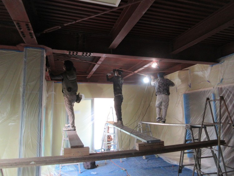 壁が仕上がってしまうと、天井塗装仕事の際に塗料で折角の壁を汚してしまうこともあり得るので、天井仕上げを先行します。おかげさまで、黒くはあっても少し愛想がある色合いに仕上がり、以前の錆止め色の赤い天井のように目を引くことがなくなり、天井そのものが高くなったように感じます。