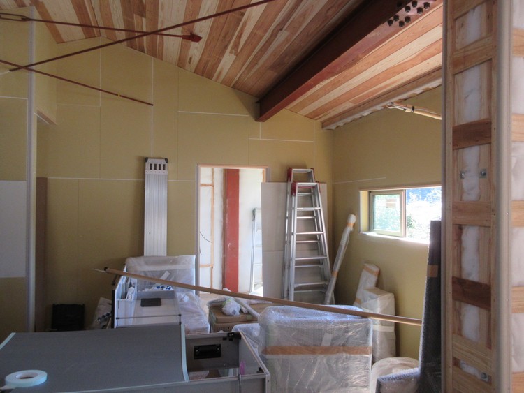 写真の柱型・梁型部分はプラスターボードを下地にして珪藻土塗で仕上げます。現在見えている天井近くの鉄骨部分は、1階の天井と同じように塗装仕上げです。鉄骨部分は湿度が高くなれば結露の心配がありますので、後の憂いがないように壁や天井には特段湿気の調節に優れた木や土などの素材を用いたのです。
