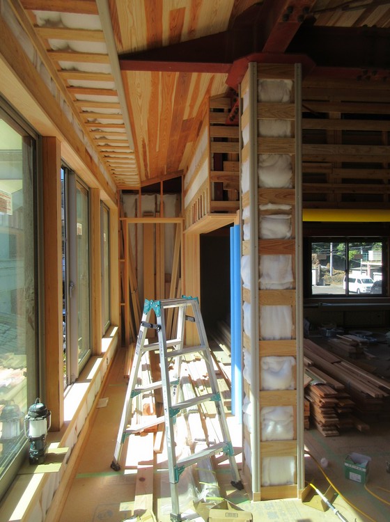 1階の大工工事の多くはすでに出来ています。2階もだんだんと形になってきました。あとはトイレ・洗面などの水廻りと、中2階の玄関廻りです。3月の末に着工してすでに7ヶ月が経とうとしています。工事範囲が広かったこともありますが、そろそろ仕上げの工事にかかりたいところです。