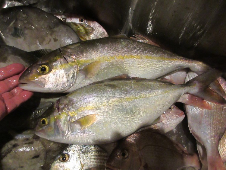 今回の目玉は今が旬のカンパチの幼魚のシオ。幼魚とは言っても結構な大きさで、これで40センチぐらいはあります。この魚は刺身にしても焼いてもどんなにして食べても美味しい。今回我が家では刺身にして、頭や骨廻りなどは塩焼きにして食べます。