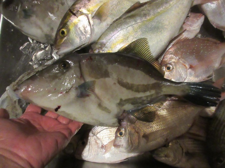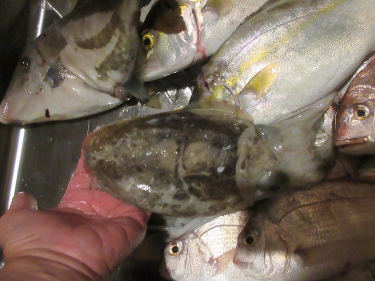 次にハゲ(たぶんウマズラ)。こちらも30センチは超えていそうです。見た目はもう一つでもハゲの類はいろいろに料理できて、いろいろに美味しい。まずは薄造りにしてモミジおろしとポン酢でいただいて、頭や骨廻りなどのアラは煮付けてもらいました。
