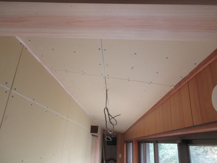 既存の廊下の天井にも和紙の仕上げをすることになった。この部分は既存をそのままに再使用する予定であったが、全体に仕上がってくるとやはり既存そのままの部分というのは気になってくるものである。