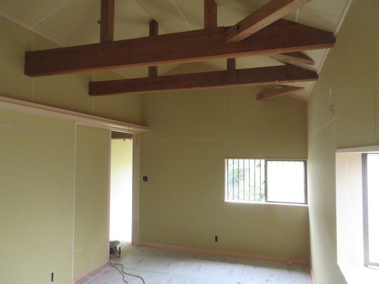 天井を屋根面にそって勾配天井としたことで、梁類が見えてきた。これまでは野材として天井裏に隠れていたので特段の仕上げはされていない。この度はあらわしとして化粧になるので、今後に表面仕上げを整える。