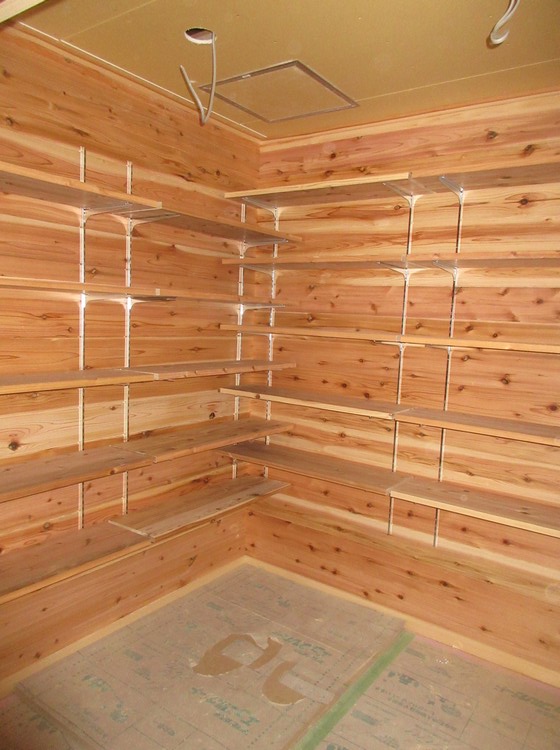 納戸・物入・クローゼットなどの大工仕事が出来上がった。壁は調湿機能に優れた杉板張り、天井は和紙貼りの仕上げである。3枚目の写真の部屋はクローゼットである。使い勝手に応じて棚類を用意する。使える壁のほぼ全面に可動の棚を用意した。使い勝手に応じて棚の高さ位置は再度設定していただくことになる。
