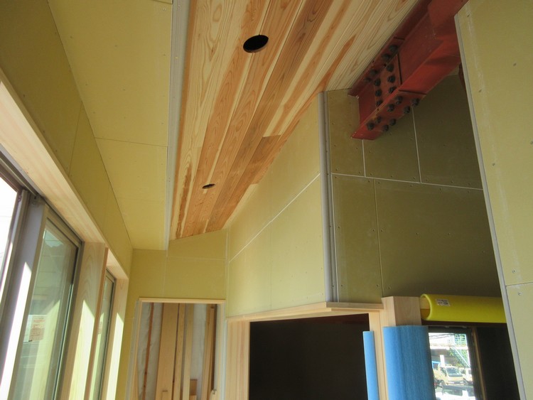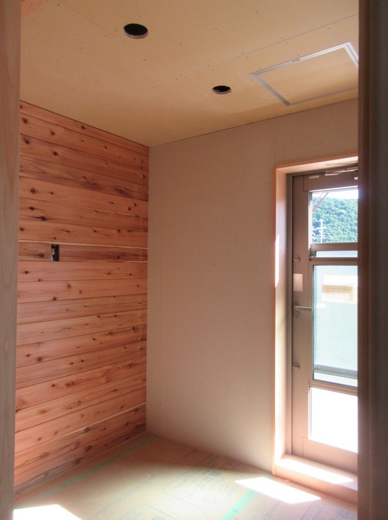 天井には杉板を張っています。断熱は屋根面で行っていますので、天井のすぐ上には断熱材がありません。ですが、杉板自体にもそこそこの断熱性能を期待しています。天井に空いている穴は照明器具用(ダウンライト)のものです。