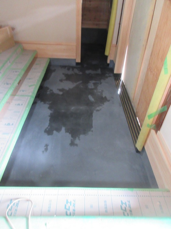 玄関の床は墨モルタル金コテ押さえ仕上げである。塗ったばかりであるので、まだ水気の引いていないところは黒く、乾いてきたところは濃いグレーに見えている。全体に乾くと濃いグレーに仕上がるが、水を打つと写真のように黒くなる。状況によって表情が変わるのが面白い。玄関全体がびしっと引き締まった感じがする。