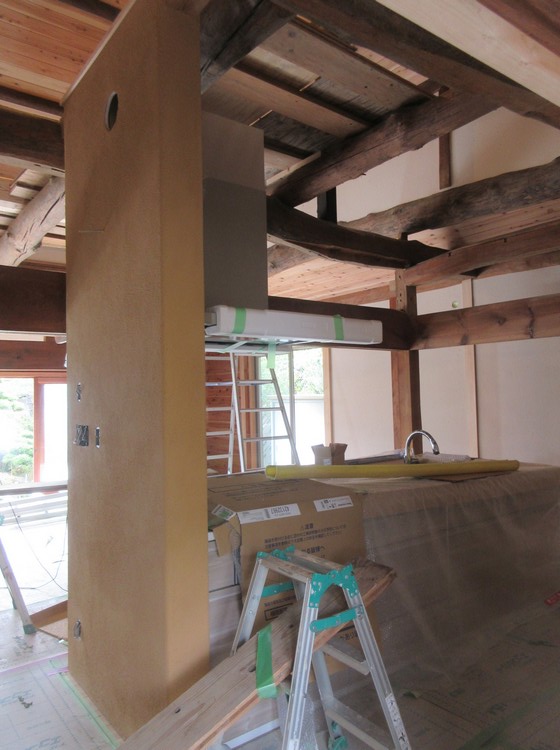 内装の仕上げが次々と出来上がっていく。写真は主に既存の壁を利用して、新しく珪藻土を塗って仕上げた壁。