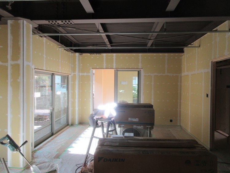 ご紹介するのは左官工事。この部屋には珪藻土を塗ります。当初は和紙貼りを予定しておりましたが、天井が鉄骨のあらわしなので、万が一の結露に備えて急遽変更したのです。和紙も珪藻土も下地は同じプラスターボードなのでその辺の融通は効きます。