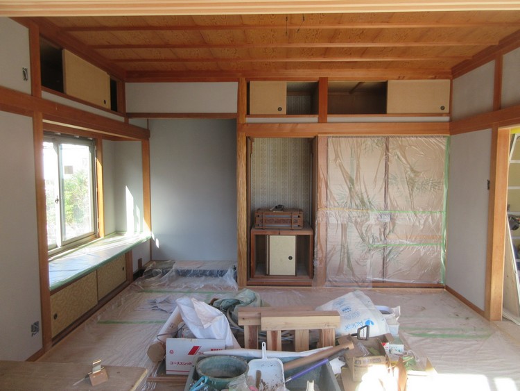 2階の個室では左官の下塗り工事が終わり乾燥養生中です。この部屋は元々畳間で、壁も塗り壁でしたので、その上に直接下地処理して、新しい珪藻土の塗りの壁にします。もちろん、改装後もタタミ間として使いますので、大工工事は入り口部分の最小限にとどめました。襖などは紙を貼り換えます。