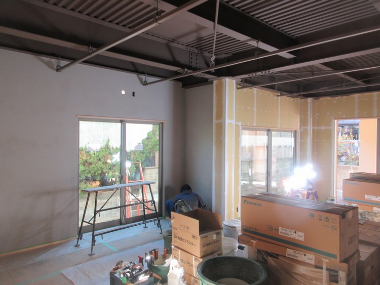 床は早くに無垢の唐松のエンコウ板で張り終わっていました。天井の塗装も出来上がっていましたが、新しく照明器具を付ける金物が付きましたので、左官工事と重ならないように日程調整してもらって、天井の鉄骨と同じ色の塗装で仕上げてもらいました。工事終盤になると仕上げ関係の各職と共に、電気や水道の設備工事も始まりますから、それぞれが重ならないように日程調整が大変です。
