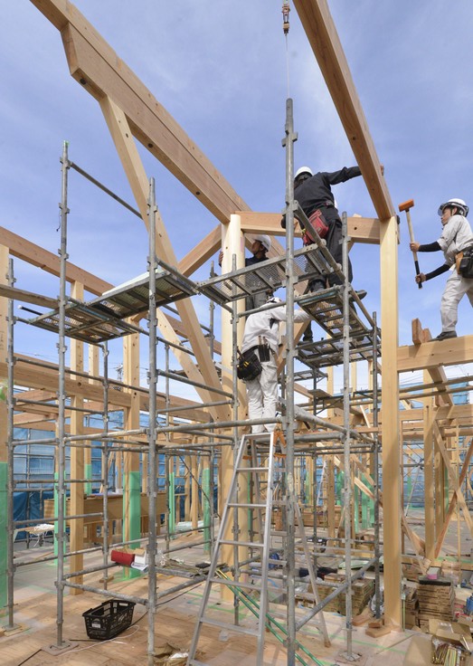 ちなみに、屋根を支える梁材で一番高いところにあるのが棟木、外壁の上の基準になる高さの梁を地回り梁と呼びます。地回り梁までが梁下の構造物、そこから上には地回梁りの高さにある梁に「束」と呼ぶ短い柱のようなものを建てて、さらに上部の屋根構造を形成する梁組を建て込んでいきます。