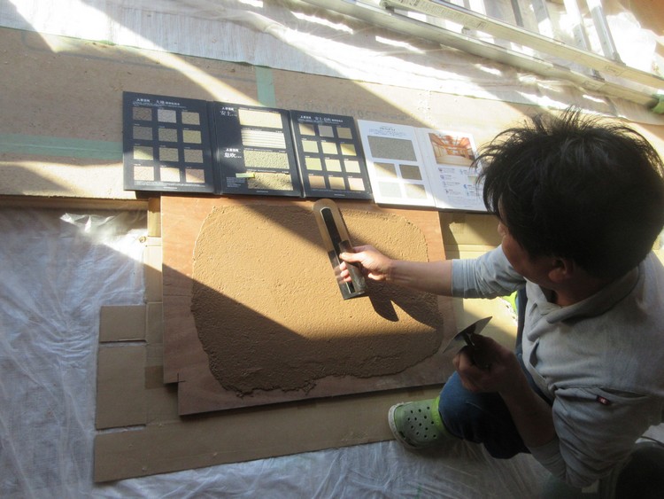 塗りはじめは私たちも、私たちに後ろから見られている職人も緊張します。少し塗ったところで、こんな感じで良いですか・・・と聞かれました。塗り壁は一般に、塗っている途中の湿っているときには質感が分かりにくいものです。正直に、分かりません・・・と答えると、職人はますます不安になります。そこで元気に、それが良いと思います・・・と答えました。