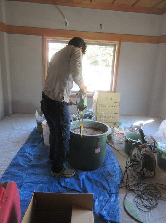 大きな樽に材料を入れて混ぜ始めます。骨材が大きめ・塗りは厚め・・・ということから、たった8帖の間なのに、思ったより多くの材料が必要みたいです。壁についてしまえば分かりにくいのですが、材料を練っているこの段階ではネタの量が多い目なのはよく分かります。