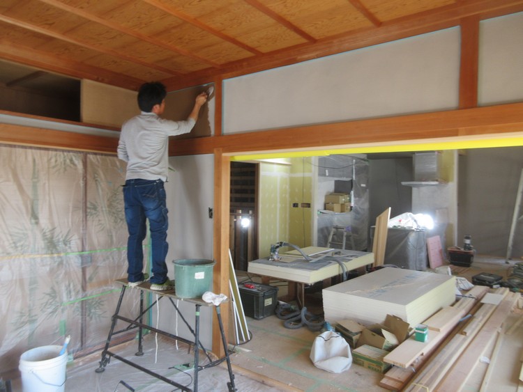 同じ珪藻土壁でも、この壁塗り材料はすこし特殊で、入っている石もワラも少し大きめ、塗り厚は平均より厚め、色は土色を基本に赤味のかかった濃い目の色にしました。つまりは、平均的な和室の壁より荒々しく素朴な感じの壁に仕上げたかったのです。