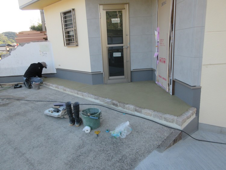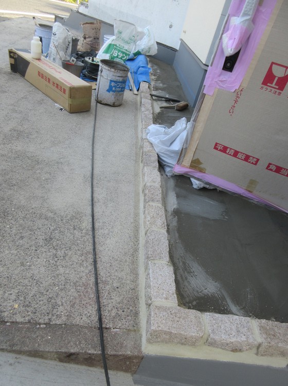 まずは段石として20センチ長さの金錆石(黄色い御影石)を並べます。ポーチの下部は念のために新たに塗り床防水をしましたので、ピンコロ石(段石)はその部分まで。あまり広くはありませんが、住宅のポーチとして充分な面積が確保できました。