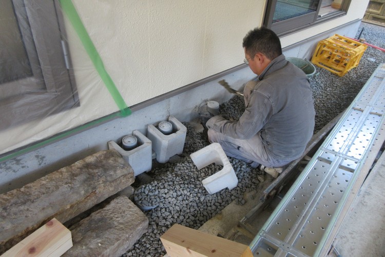 外部では給排水管の屋外への取り出し口の施工をしています。中村設計では各種配管類の劣化対応から、後々配管の交換が容易なように、配管は基礎の下に埋め込まず立ち上がり部を貫通させて、外に出たとっころから埋設配管としています。