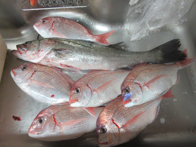 タコや石鯛がない時には、何か変わった魚はないか・・・と尋ねます。そうして今回見つけたのがスズキです。隣のチダイが結構大きかったのでそんなに大きくは見えませんが、これでも60センチほどはあります。