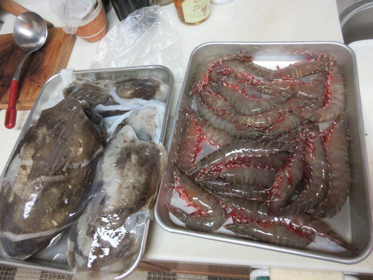 イカはコウイカもアオリイカもほとんど刺身でいただきます。足などはてんぷらが多いです。このところはうちの家のマイブームでピザのトッピングとしても活躍しています。骨と内臓、くちばしと目玉以外はすべていただきます。やはり、どんなに調理しても美味しいです。足赤エビは半分ほど刺身と焼き物でいただき、残りは冷凍しました。後々お鍋か何かでいただきます。