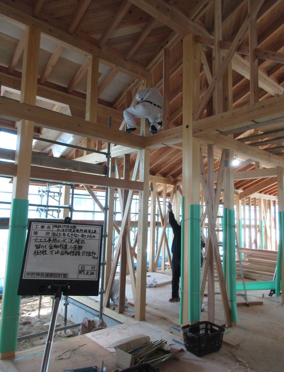 第1回目には、梁上にはまだ筋交いも充分に入っていませんでしたから、今回が梁上の本格的な検査になります。ほとんどのところはしっかりと出来ていても、人間のすることですから間違いや忘れもあります。検査を重ねるのはそういうところのチェックにも役立ちます。