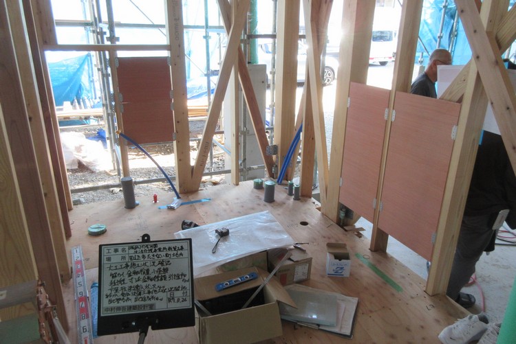 1階では各設備類の床貫通部分も出来始めています。壁部分の板は、壁に取り付ける設備類の下地用です。いつもの床下断熱の建物とは断熱形式が違い、この建物は基礎内断熱ですから床の貫通部分の気密には気を使う必要がありません。基礎内断熱では床下と室内は同じ温熱環境・・・として断熱構造を考えるからです。
