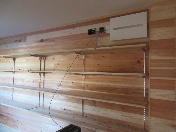 電源の本引き込みも終わり、分電盤もすでに据わっています。これまでと比べ3倍ほどの回路数を持つ分電盤で、このところの電化製品の増加にも備えます。分電盤の左にあるのは光やテレビ線などの端子の取り出し口です。これらは空の分電盤の中にしまい込んでスッキリと・・・と考えていた時期もありましたが、結局時代の流れでその箱からあふれる部品も出てきますので、このところは直下に棚を設けてそこに諸々の機械を置くことにしています。