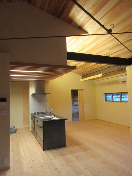 台所ではほとんどの照明を間接照明のように配置して、器具が直接目に入らないのに明るい・・・と感じるようにしました。キッチンセット直上の灯かりは、格子に隠れてこの角度からはほとんど見えません。食堂部分では格子の上に大きいめの間接照明を仕込みました。これで不自由ないほどの照度は取れますが、いくつかの雰囲気を楽しめるようにテーブルの上にもコード吊りの低く降りてくる照明を用意しますし、キッチンの向かいの窓下に付く予定の本棚の足元にも間接照明を入れます。