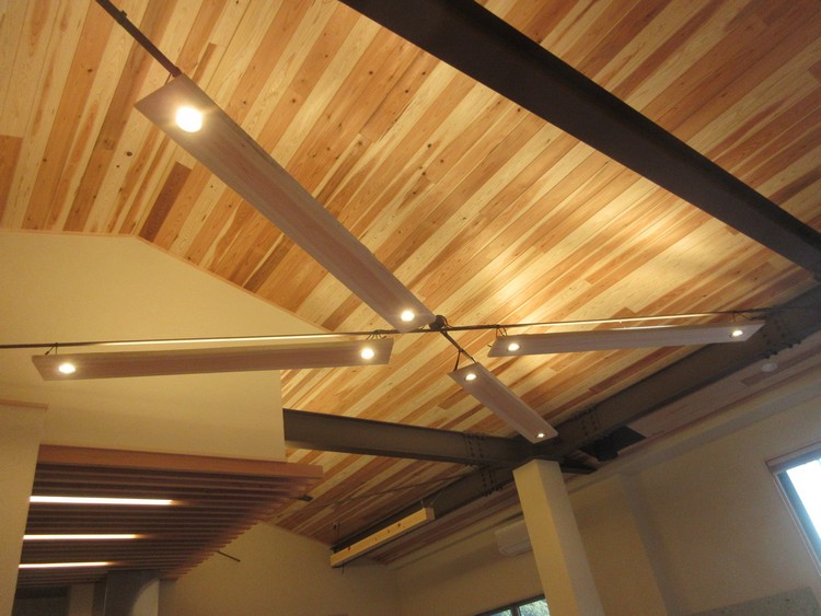 リビングでは、煩雑に感じるあらわし仕上げの鉄骨をどう意匠に生かすか・・・といろいろと考えた挙句、中空にいかにも邪魔者然として出てくる鉄骨ブレースに、桧の板を吊り下げ、それを造り付けの照明器具として利用することにしました。板の上には天井照らしの大きい目の間接照明、下には直径75ミリの小さなダウンライトを仕込んでいます。ダウンライトは挟角照射のものを選びましたので、上部の間接照明を消せば8個の光の筋が床に落ちます。