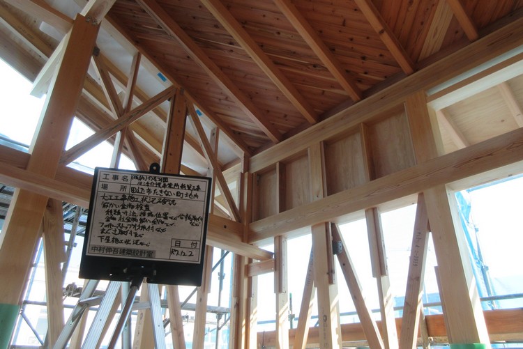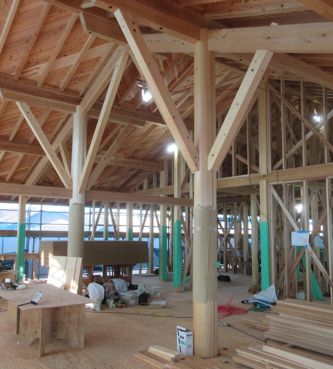 構造体の加工ができ、金物などの補強も終えて、室内足場がいったん取り払われました。特徴的な桧の丸太柱と枝に見立てた方杖が良く見えるようになって、完成時の室内の様子がイメージできます。天井面の垂木や斜め張りの杉の野地板が最終的には見えなくなることが残念なのですが・・・。