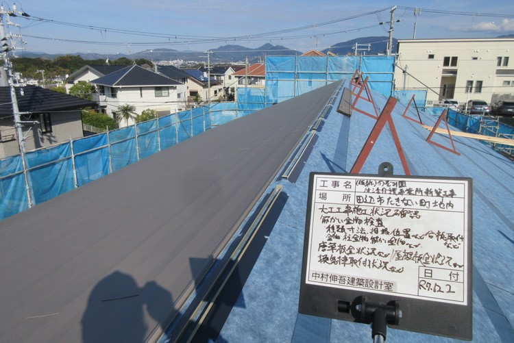 屋根も板金工事が進んでいます。片方の流れはすでにガルバリウム鋼板の横吹きが出来ています。もう半分の方が葺き終わると換気棟の施工をします。換気棟用の金物はすでに付いていますが、まだ防水層のゴムアスシートは切り開かれていません。これが切り開かれて外壁と屋根の通気層を通ってきた空気が外部に排出されることになります。現時点で排出口を造ってしまうと急な雨ふりに対応できませんので切り欠き加工は屋根工事の最終工程です。