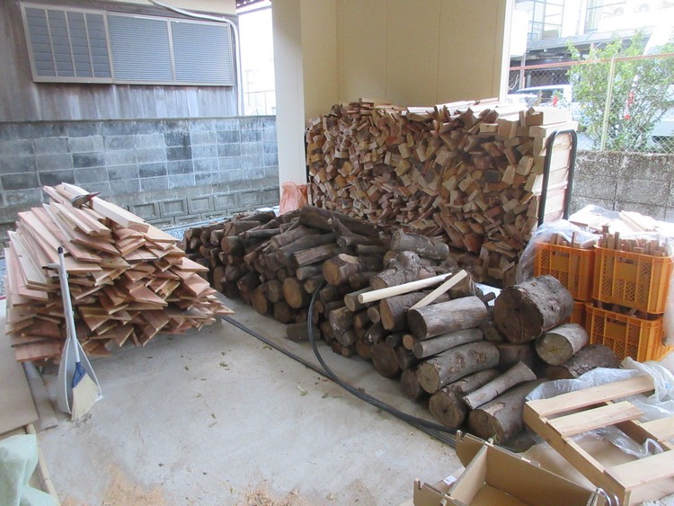 1枚目の写真は今回工事で出た端材。これを40センチほどに切って、板材は細かく割って焚き付けに、柱材などは半分に割って薪にします。小さなものはそのまま燃やせるのでコンテナに整理します。簡単に言えばこれだけでも、実際の作業は結構大変で、端材と焚き付けのコンテナだけでも10ケースほどが満杯になりました。