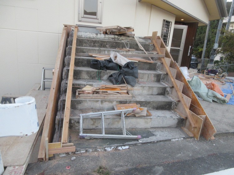 室内の工事はすでに仕上がって、外構工事が始まっています。最後に残ったのは階段の手直しです。この階段はこれまで玄関に向かうものでしたが、今後はこれが勝手口用の階段になります。