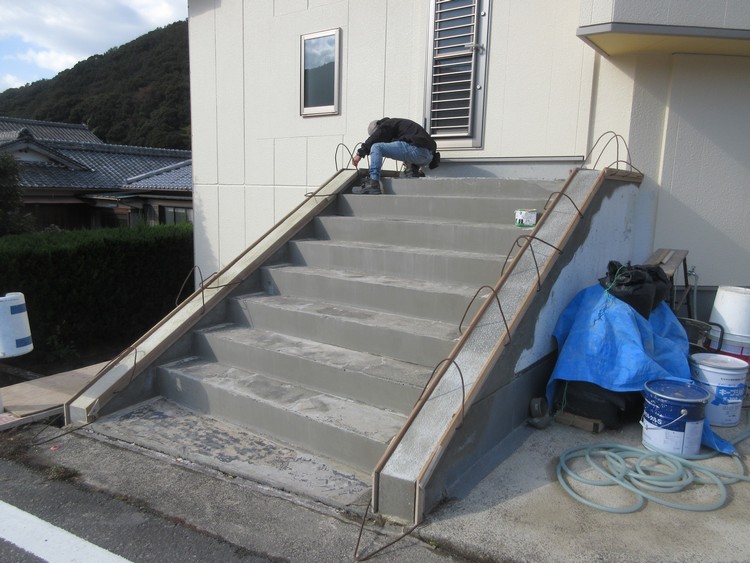 コンクリートが打ち終わると次は笠木です。この部分はモルタルでコンクリート構造物の上に新しく造ります。段の踏み面部分も割れが激しく、そのままにしておくと水の侵入で鉄骨の構造体に悪い影響を与えそうなので塗り直します。