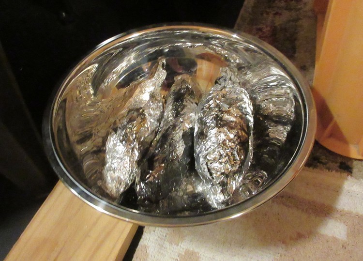 うちでは、あまり大きな芋は避けて、一人で食べごろの大きさのものを選んで作ります。ひとつづつ新聞紙にくるんだままで水に浸し、さらにアルミホイールにくるんでの投入です。熾(おき)をかき分けて投入の後は、庫内の温度が急に下がらないように小さな薪を数本入れておきます。芋の大きさにもよりますが、これで待つこと30分から40分。