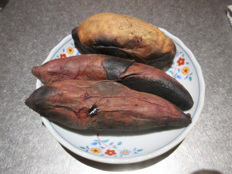 芋が焼けた良い香りがしてきたら、まず間違いなく立派に出来上がっています。念のためには、箸で突き刺してみて、抵抗なく入っていったら出来上がり、途中で何か硬いものに突き当たるようならもう少し焼きます。禁物は焼きすぎです。あまり長く入れっぱなしにしておくと、全体が真っ黒な炭になってしまってとうてい食べ物にはなりませんので要注意です。