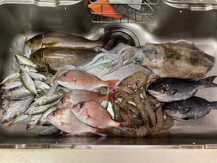 他にはいつものアジとタイ。この辺は我が家の常備品(?)となっていまして、タイなどは開いて干して・・・いつでも冷蔵庫に入っています。エビも重宝しています。生で刺身に、そのまま塩焼きに、時にはお鍋に・・・冷凍もしておけるので、いざという時にとても役立ちます。