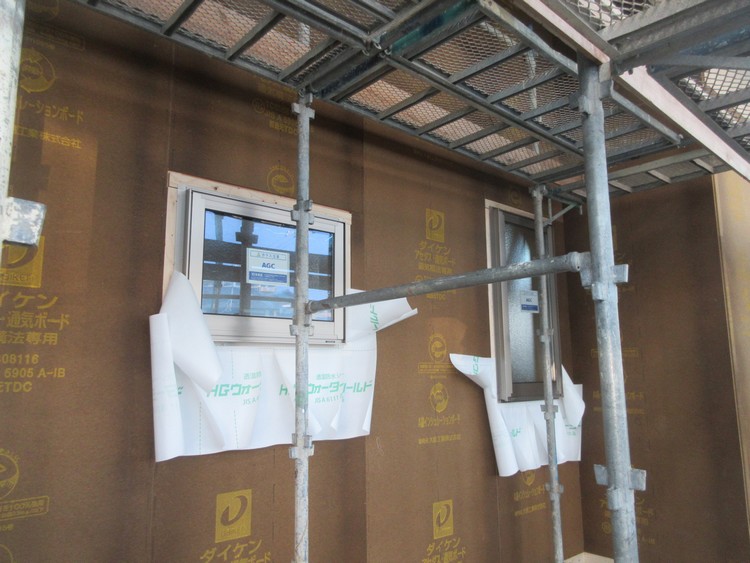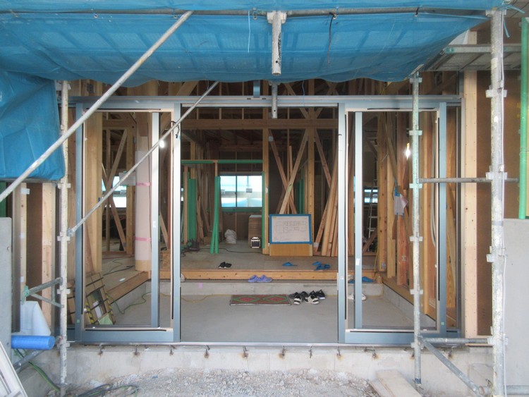 外壁にはアルミサッシが付き始めました。今回建物は木造ですので、アルミサッシも木造用です。木造用のサッシには既製品寸法が設定されているので、建物各部の寸法は出来るだけ既製品寸法が納まるように工夫して設定されています。