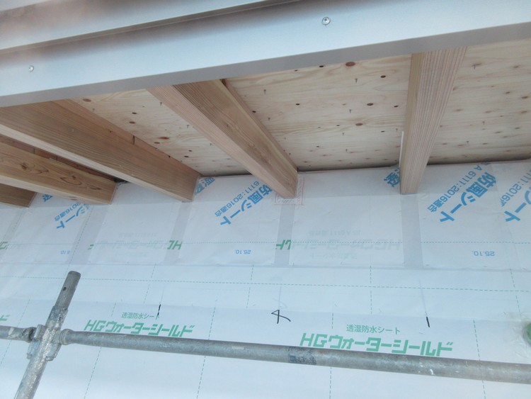 木質系のインシュレーションボードの上に透湿防水シートが張られています。これが外壁の防水層となります。透湿防水シートは屋外からの水の侵入を防ぎながら、壁体内の湿気は通気層に排出できるとても便利なシートです。