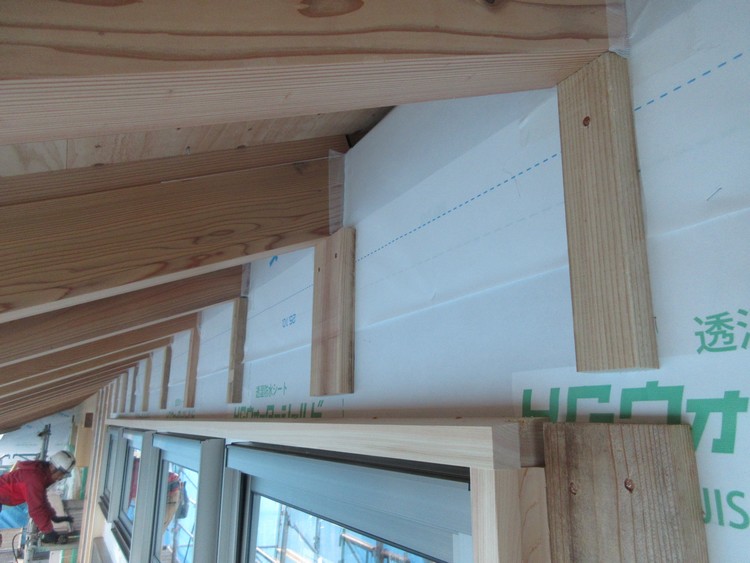 シートの上には通気の桟が付き始めています。この建物では外壁開口部のサッシ廻りには木製の外部枠が付きますので、通気層はこの枠が入っても充分に通気出来るだけの隙間を確保しながら施工します。木製の外部枠は、サッシが外壁から奥まらないように見込みの調整をする役目と、木の建物らしさを表現するために採用しています。