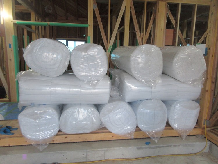 断熱材も搬入されています。使用されているのはパーフェクトバリアという、半分ほどは衣料のフリースやペットボトルからリサイクルされた材料からできるポリエステル断熱材です。この断熱材の特徴はグラスウールやロックウールなどとは違って人にやさしいこと。だからビニールの袋には入っていません。