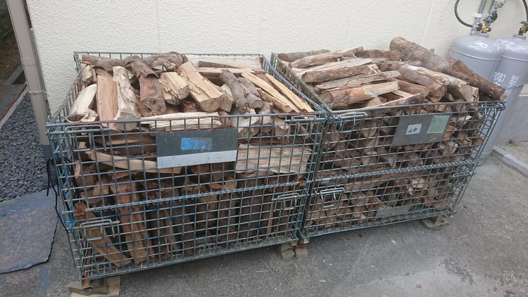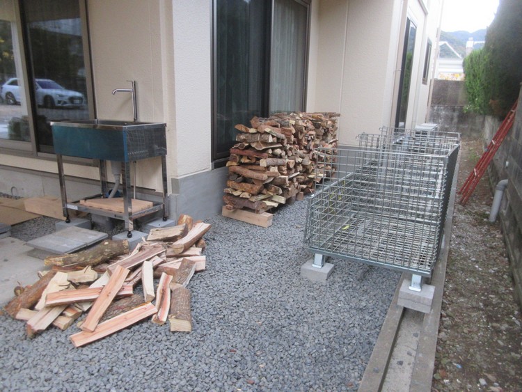 入れ物はなくとも、とりあえず割って積んでおけば何とかなる・・・と思って割って建物廻りに積み始めました。建物本体は鉄骨ALC(軽量気泡コンクリート)造でシロアリ被害の心配はそんなにないと思いますが、やはりなにかと心配です。そこで、使い勝手が良かったメッシュパレットを中古で買い足しました。まずは4台です。これに、これから割る広葉樹薪を入れていきます。