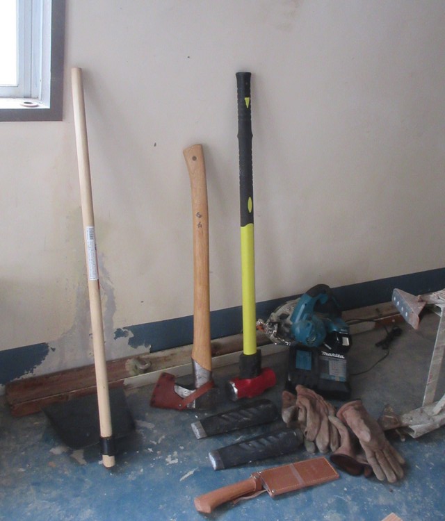 私のところの薪割道具はオノが1丁とナタが1丁、それに電動丸ノコを足してやってきました。しかし、硬くて硬くて到底歯が立たない・・・という木もやはりあります。友達は、人力では限りがある、薪割機を買え!中古で上等、機械のすごさを思い知ることになる・・・と言います。そりゃあそうでしょうけど、大変でも筋肉痛をおこしながら汗だくになるのも結構面白い・・・そう思って、硬い木対策として新しくハンマーとクサビを買いました。