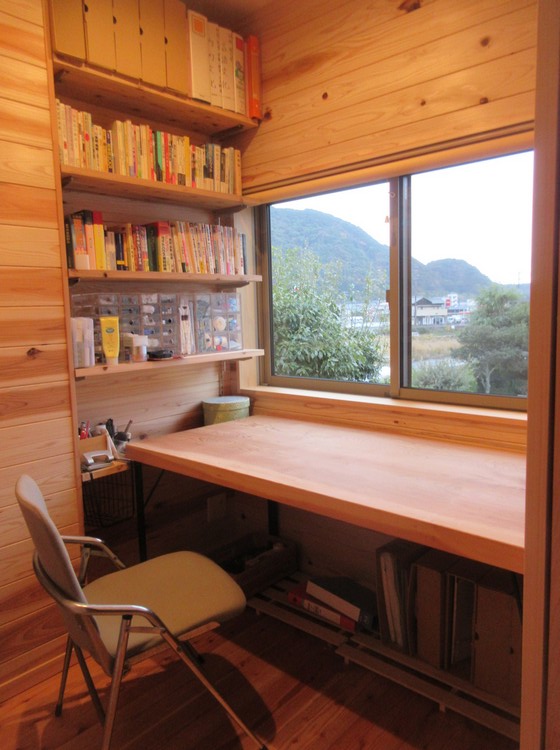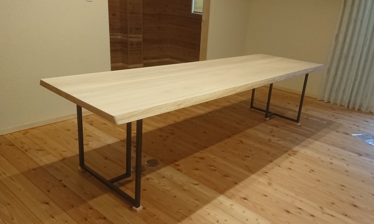 5枚目の写真は仕事用の大テーブルです。パソコンや資料を一堂に広げて作業ができ、ある時にはこの机で打ち合わせやミーティングなども出来るようにと2.8メートルの長さがあります。素材は龍神産の桧。流石に1枚物はなかったので、3枚の板をはぎ合わせて造っています。足は鉄製です。